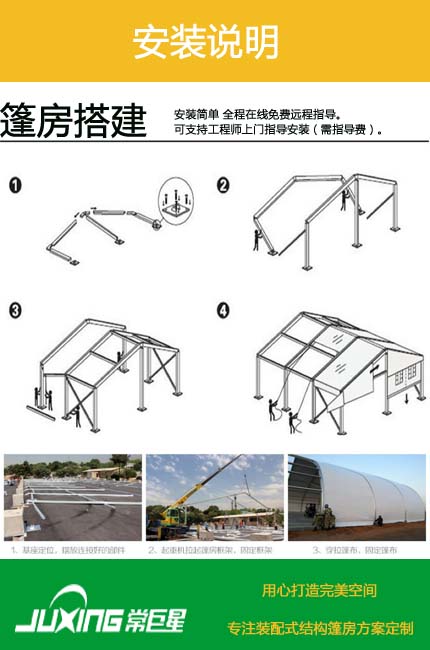 常州巨星裝配式篷房公司是一家篷房研發(fā)、生產(chǎn)、銷售、租賃于一體的綜合性篷房公司。巨星公司秉著誠信經(jīng)營、客戶至上的經(jīng)驗(yàn)理念服務(wù)客戶。常巨星篷房適用于:室外臨時(shí)展廳,餐飲區(qū)、產(chǎn)品促銷、主題研討會(huì)、奠基儀式、戶外活動(dòng)、公司慶典、短期倉庫、婚禮等。“銳意進(jìn)取”的意識(shí)是巨星追趕時(shí)尚潮流的保障。美侖美奐的品質(zhì)、優(yōu)良周到的服務(wù)是我們至誠的追求和不變的信念。現(xiàn)有篷房主體框架為中空鋁合金結(jié)構(gòu),連接部位為采用國家焊接鋼結(jié)構(gòu),可調(diào)節(jié)式基座可彌補(bǔ)場(chǎng)地的不平,篷房采用PVC篷布,該篷布具有不拉伸的良好性能,不透光,采用高頻焊接技術(shù),篷房抗風(fēng)能力達(dá)到80-100公里/小時(shí)。具有體積小,儲(chǔ)存方便,拆裝靈活快捷易運(yùn)輸?shù)忍攸c(diǎn),單位組合式結(jié)構(gòu),可根據(jù)場(chǎng)地的大小自由增加,對(duì)搭建場(chǎng)地?zé)o特殊要求,一般場(chǎng)地如草地、大理石地、瀝青地面、水泥地均可。篷房?jī)?nèi)無支柱,場(chǎng)地空間得到利用。