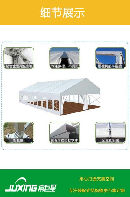 常巨星篷房適用于:室外臨時展廳,新聞發布會,巡回展,時裝秀,接待問訊處,貴賓休息廳,餐飲區、產品促銷、主題研討會、奠基儀式、戶外活動、公司慶典、短期倉庫、婚禮等。我們關注篷房的每一個細節,致力于打造一個舒適戶外活動空間。現有篷房主體框架為中空鋁合金結構,連接部位為采用國家焊接鋼結構,可調節式基座可彌補場地的不平,篷房采用PVC篷布,該篷布具有不拉伸的良好性能,不透光,采用高頻焊接技術,篷房抗風能力達到80-100公里/小時。具有體積小,儲存方便,拆裝靈活快捷易運輸等特點,單位組合式結構,可根據場地的大小自由增加,對搭建場地無特殊要求,一般場地如草地、大理石地、瀝青地面、水泥地均可。篷房內無支柱,場地空間得到利用。